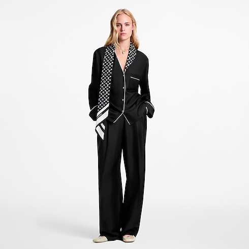 Sophisticated seasonal codes elevate this pajama top into an elegant statement. It is crafted from fluid silk twill in a classic boxy fit finished with contrasting piping for a timeless loungewear look. The V neckline is embellished with a fluid Monogram scarf insert for versatile styling, while domed golden buttons fasten the front.