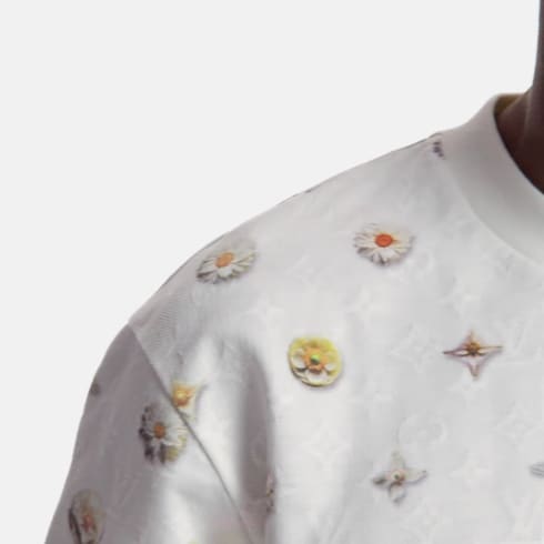 This milky white T-shirt brings a cheerful floral accent to casual spring looks. It is crafted from organic cotton piqué with a softly textured Monogram jacquard knit and overprinted with this collection’s gradient-effect LV Flowers motif in delicate white and yellow tones. This piece can be layered with items in this collection’s Blooming Monogram motif for a graphic effect.