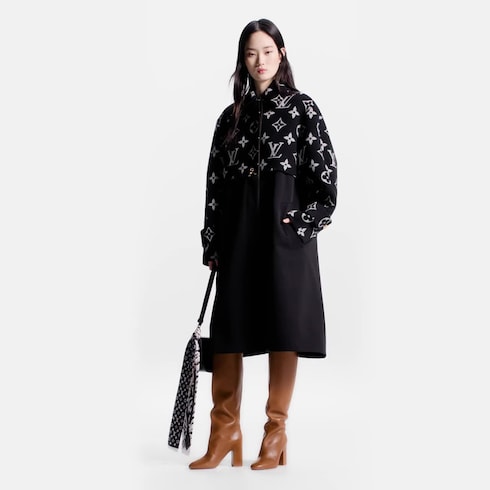 The top half of this chic coat is crafted from plush double face cashgora featuring a graphic oversized Monogram jacquard, while the lower half strikes a contrast in plain black technical gabardine. Crafted in a roomy straight-cut shape for an elegant enveloping fit, while a collar and golden braided buttons complete the look with a polished feel.