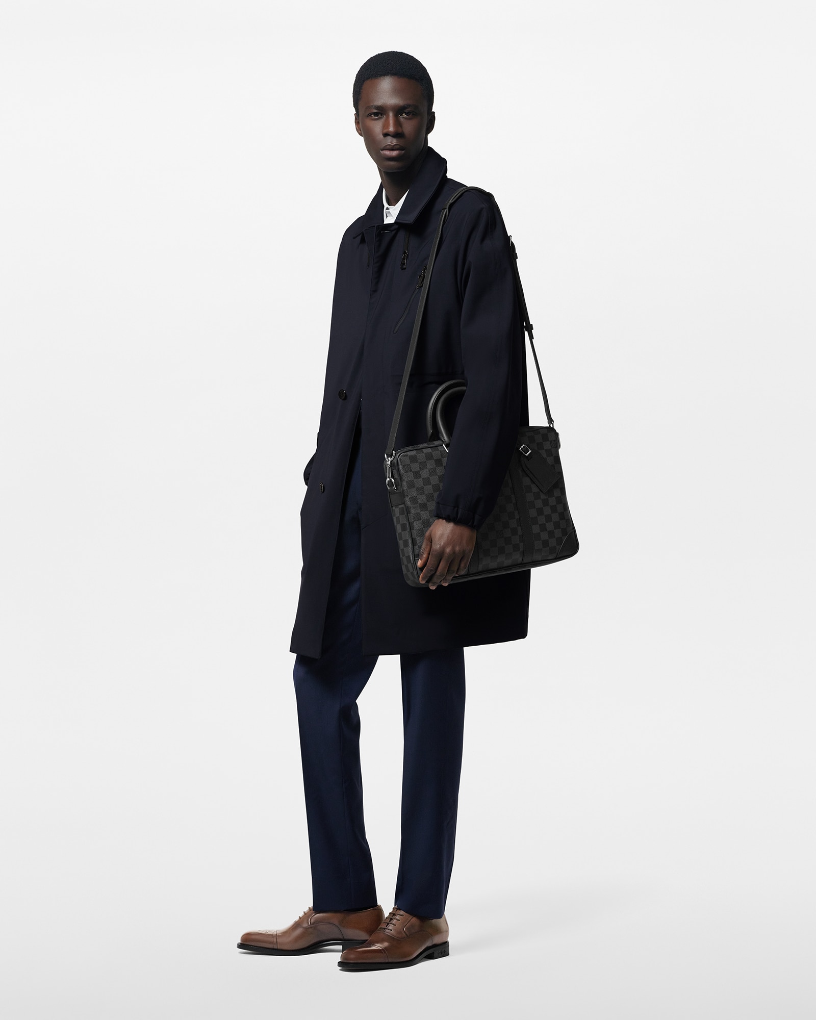 The Porte-Documents Voyage PM briefcase is made from Damier Graphite coated canvas with black-leather side bands, reinforced corners, top handles, and name tag. There’s an outside pocket for a smart phone and a padded interior compartment large enough for a 13-inch laptop. The removable and adjustable strap enables shoulder carry.