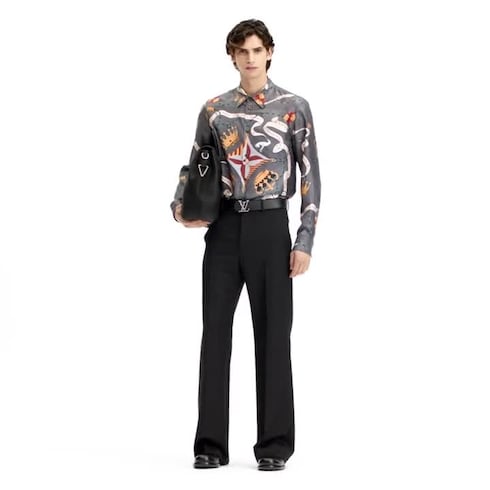 This fluid shirt crafted from pure silk is adorned with this collection’s regal LV Emblem motif. The graphic print on a dark gray base features fluttering ribbons incorporating House signatures, crowns, Monogram Flowers, a pedigree dog and a playful fox. This vibrant and sophisticated piece is perfect for festive evening looks.