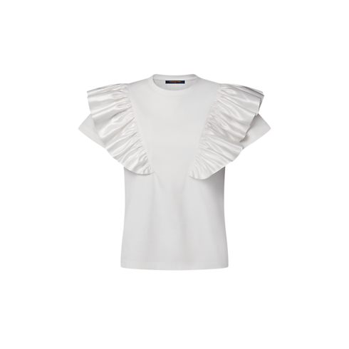 This T-shirt from the runway collection makes a sculptural statement thanks to two shiny satin ruffle trims adding romantic volume to the shoulders. It is cut from breathable cotton jersey in a timeless straight shape for versatile styling. A tone-on-tone leather Louis Vuitton Paris patch adds an understated signature touch to the back.