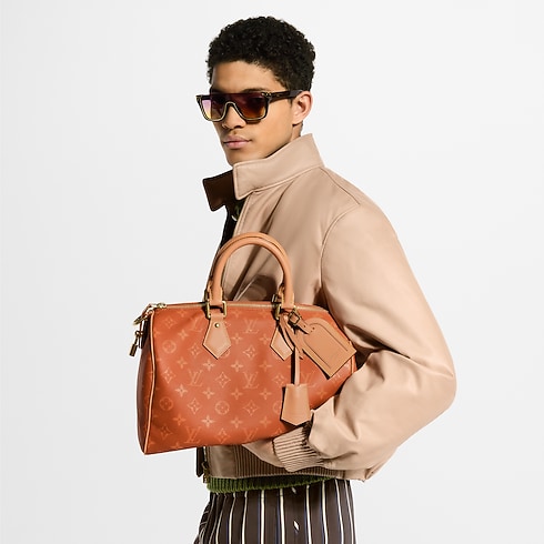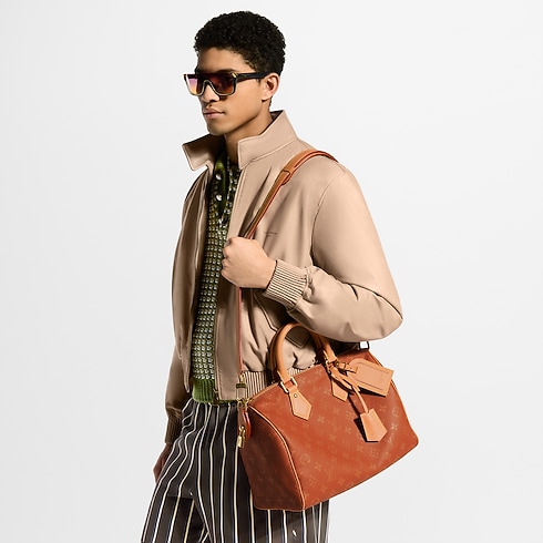 An iconic silhouette comes alive in color with the Speedy P9 Bandoulière 30, crafted from calfskin leather with a tonal Monogram print. Contrasting calfskin highlights the rolled-leather top handles, removable strap, and distinctive name tag. Inside, a golden plate – featured in all the House’s Speedy P9 bags – attests to the exceptional craftsmanship of this exclusive piece.