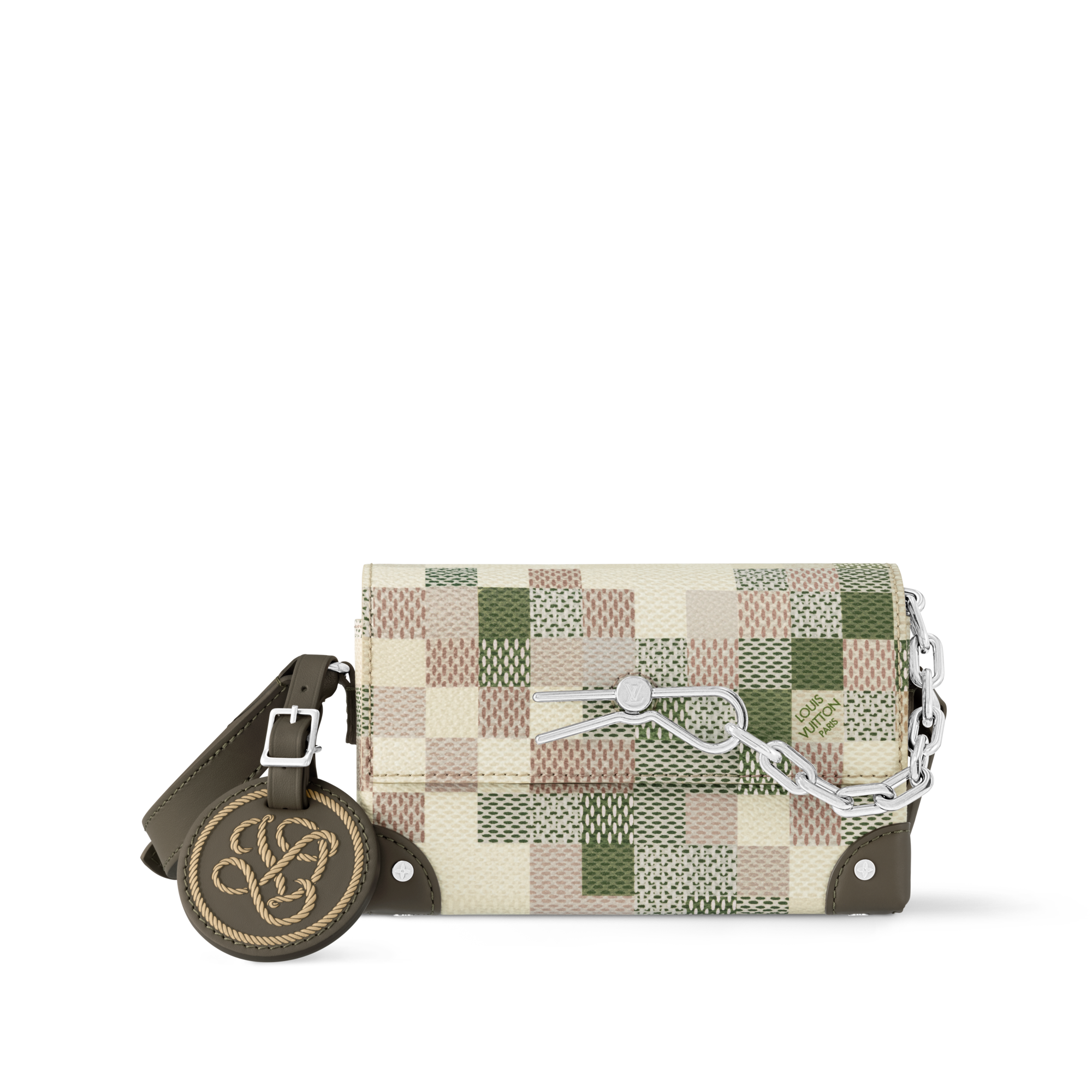 The Steamer Wearable Wallet, crafted from Monogram Heritage canvas, features a new decorative ball chain and a square padlock signed “Louis Vuitton Marque Déposée.” The rivets on the reinforced leather corners match the colour of the lock. The interior, finished with striped lining, includes a zipped pocket. An adjustable strap allows for both shoulder and cross-body wear.