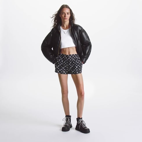 These casual shorts combine a sporty vibe with a seasonal Louis Vuitton signature. Crafted from technical fabric, they are adorned with the collection’s stencil-effect Monogram motif. Details include an elasticated waist, hook closure and two zipped pockets at the sides.
