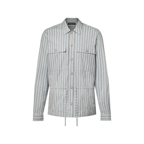 This organic cotton overshirt, woven with a striped jacquard in subtle blue tones, is a versatile layering piece for this season’s relaxed elegance. It has two buttoned flap pockets on the chest and a drawstring waist, while a printed L.V.M. Legacy signature lends a graphic accent to the back. Mother-of-pearl effect buttons add a lustrous finishing touch.