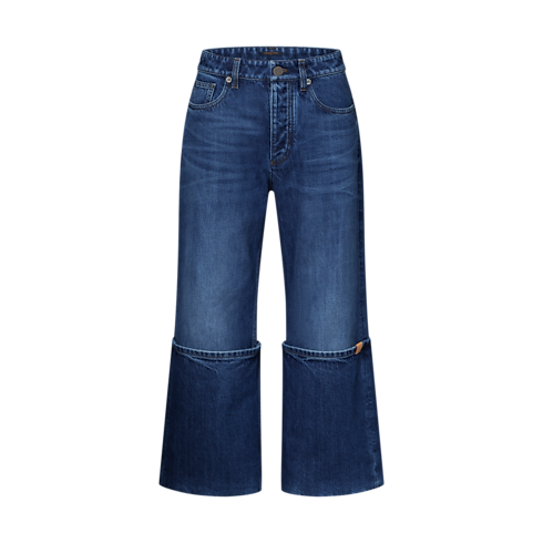 A play of proportion refreshes these staple jeans with a statement twist. They have a classic look in raw denim in a subtle gradient finish accented with contrasting topstitching highlighting the construction. They are cut in a comfortable high-rise straight shape with exaggerated XL cuffs, one of which is discreetly signed with a leather LV Circle tab.