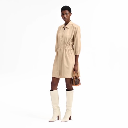 This shirt dress is revisited with modern touches for versatile wear. It is elegantly reworked in soft peach-effect cotton in a timeless shade. A crisp collar underscores the smart style, while the waistline and three-quarter sleeves are elasticized for a chic cinched fit and the front is fastened with a sleek double-ended zipper.