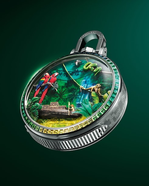 In an embodiment of audacious creativity, Louis Vuitton ventures into the heart of the Amazon rainforest to unveil one of its most complicated watches to date, the Escale en Amazonie. Presenting a unique double perspective, this striking pocket watch showcases seven animations within the lush landscape on the dial, while the transparent case back reveals a captivating mechanical vision: the LFT AU14.03 automaton and minute repeater caliber, featuring exquisite artisanal finishes.