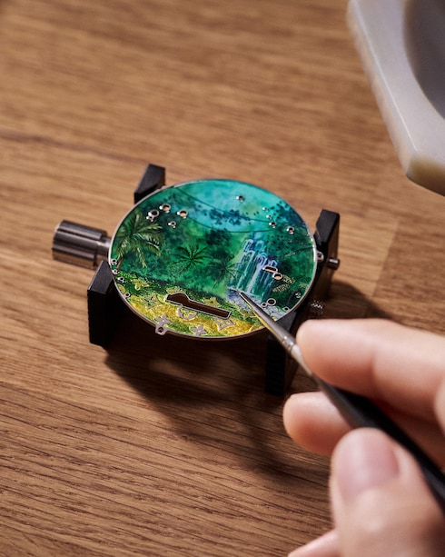 An ode to Japan, the Escale au Mont Fuji pocket watch captures the iconic peak at sunrise, revealing a serene landscape come to life through four animations set to a minute repeater. Encircled by a sapphire-set bezel, branches of sakura in bloom unfurl across the scene, their forms reinterpreted as Louis Vuitton Monogram flowers — uniting the House's mechanical virtuosity with its exceptional Métiers d’Art.