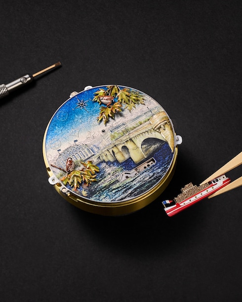 An ode to the House’s trunk-making heritage and spirit of innovation, the Escale au Pont-Neuf pocket watch celebrates the history of Louis Vuitton – situated on the banks of the river Seine, overlooking Paris’ oldest bridge. The dial’s picturesque landscape is enlivened through seven animations, powered by the Manufacture’s most complex mechanical movement to date – the manual-winding LFT AU14.03 caliber – showcasing its meticulous craftsmanship through the case back.
