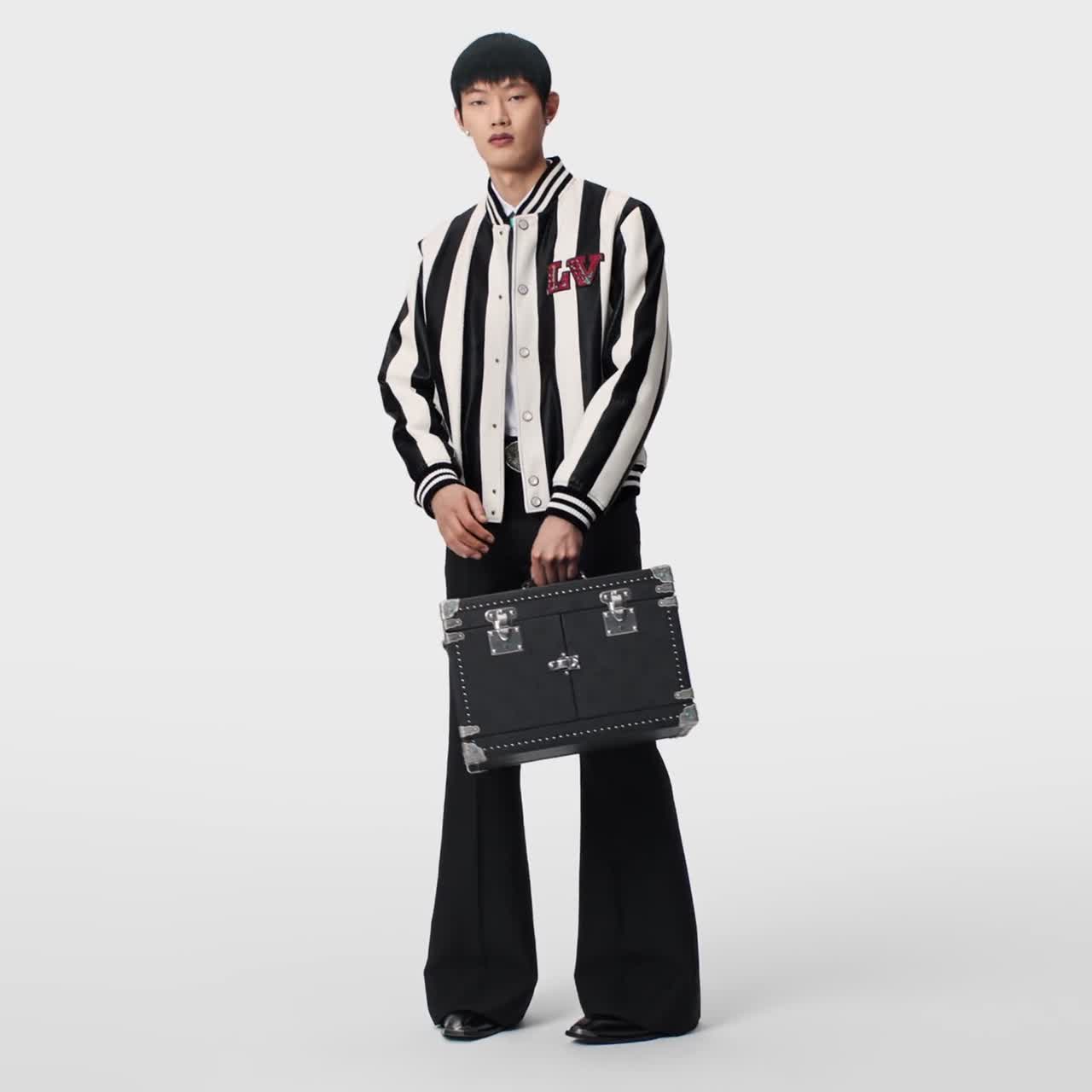Jaket bomber ikonis dari runway pergelaran koleksi Fall-Winter 2024 ini memperlihatkan kepiawaian Rumah Mode. Desainnya menampilkan corak garis-garis vertikal hitam dan putih yang dibuat dari material python skin dengan teknik intarsia. Bagian dada dan