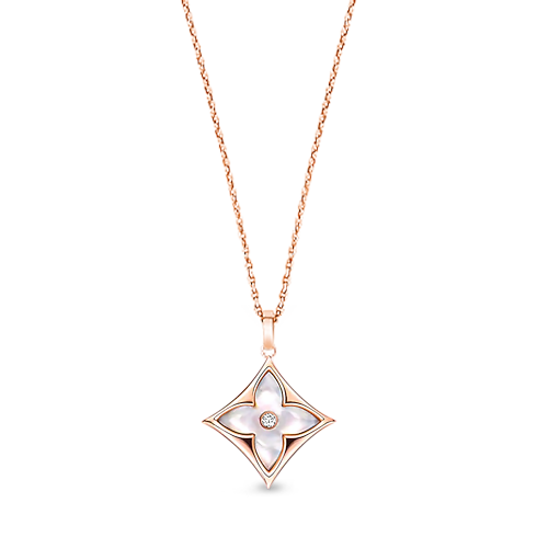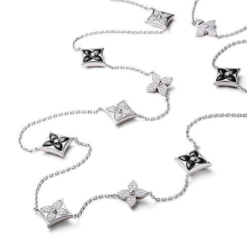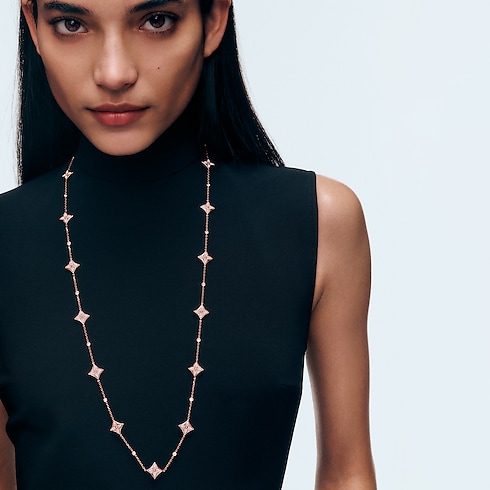 路易威登的頸鏈與吊墜系列以天然鑽石配搭 18K 黃金、白金、玫瑰金、鈦金及純銀等貴金屬匠製而成,部分頸鏈與吊墜更鑲嵌彩色寶石,展現高級珠寶的多樣性與奢華品質。
