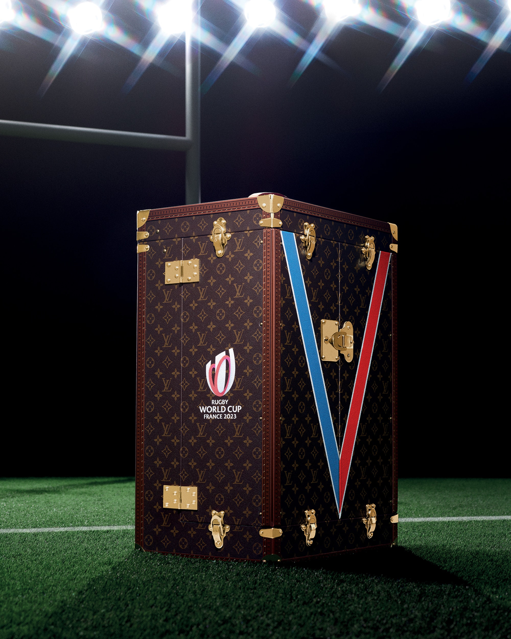 繼 2015 年首度合作後,路易威登再次成為 2023 年法國世界盃欖球賽的官方獎盃行李箱供應商,以特製的手提箱盛載傳奇的韋伯埃利斯盃,代表這項長期合作的新篇章。以人手製作的行李箱鋪上呼應賽事的主色的經典 Monogram 帆布,而羅馬數目字「XV」則代表一隊欖球隊的球員人數。手提箱內也鋪上 Pantone 藍色的高級路易威登皮革襯裡,與「V」形圖案用色一致,開創品牌獎盃行李箱設計的先河。