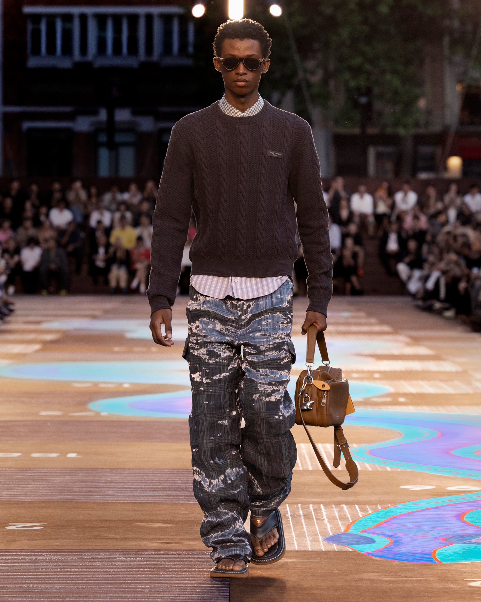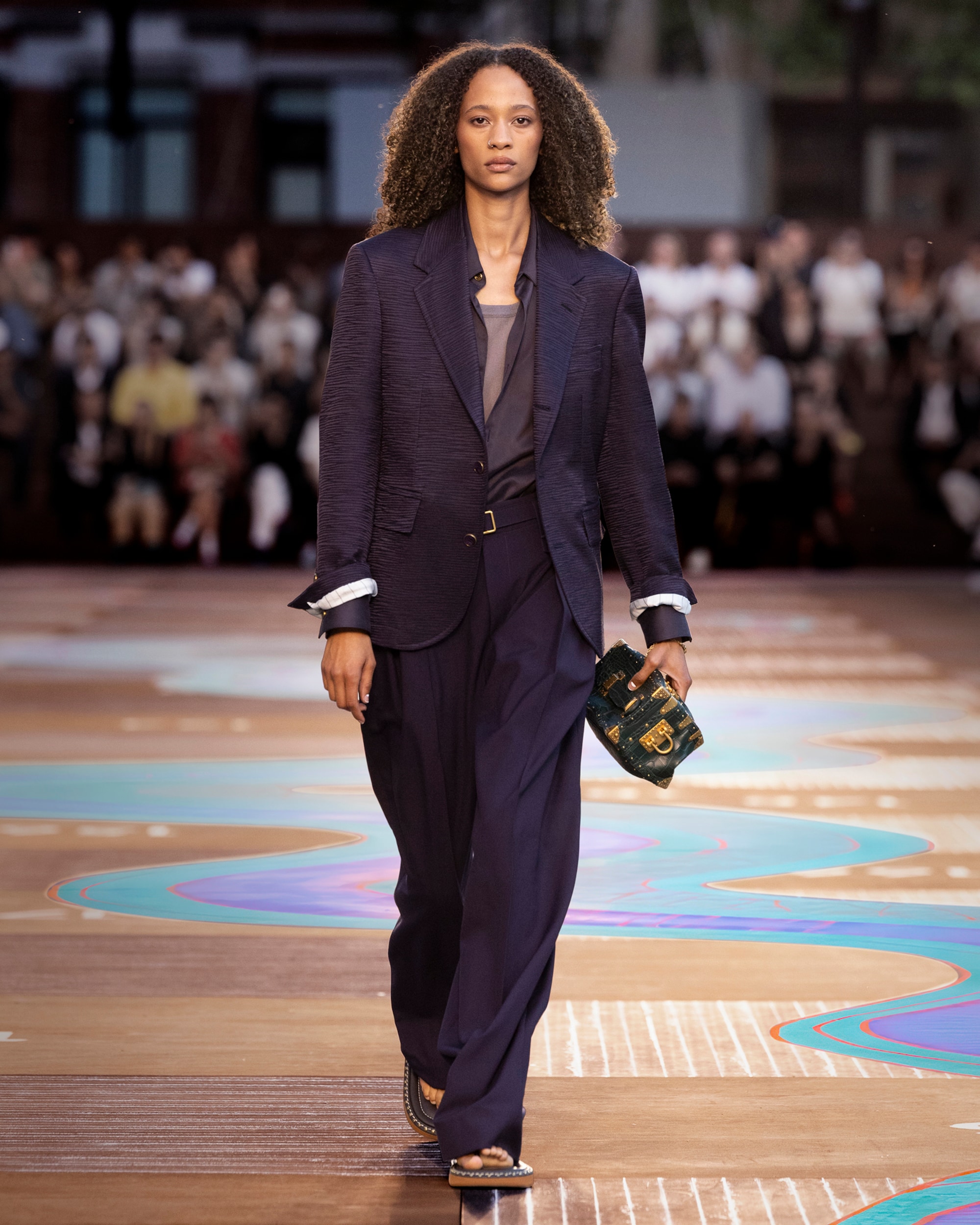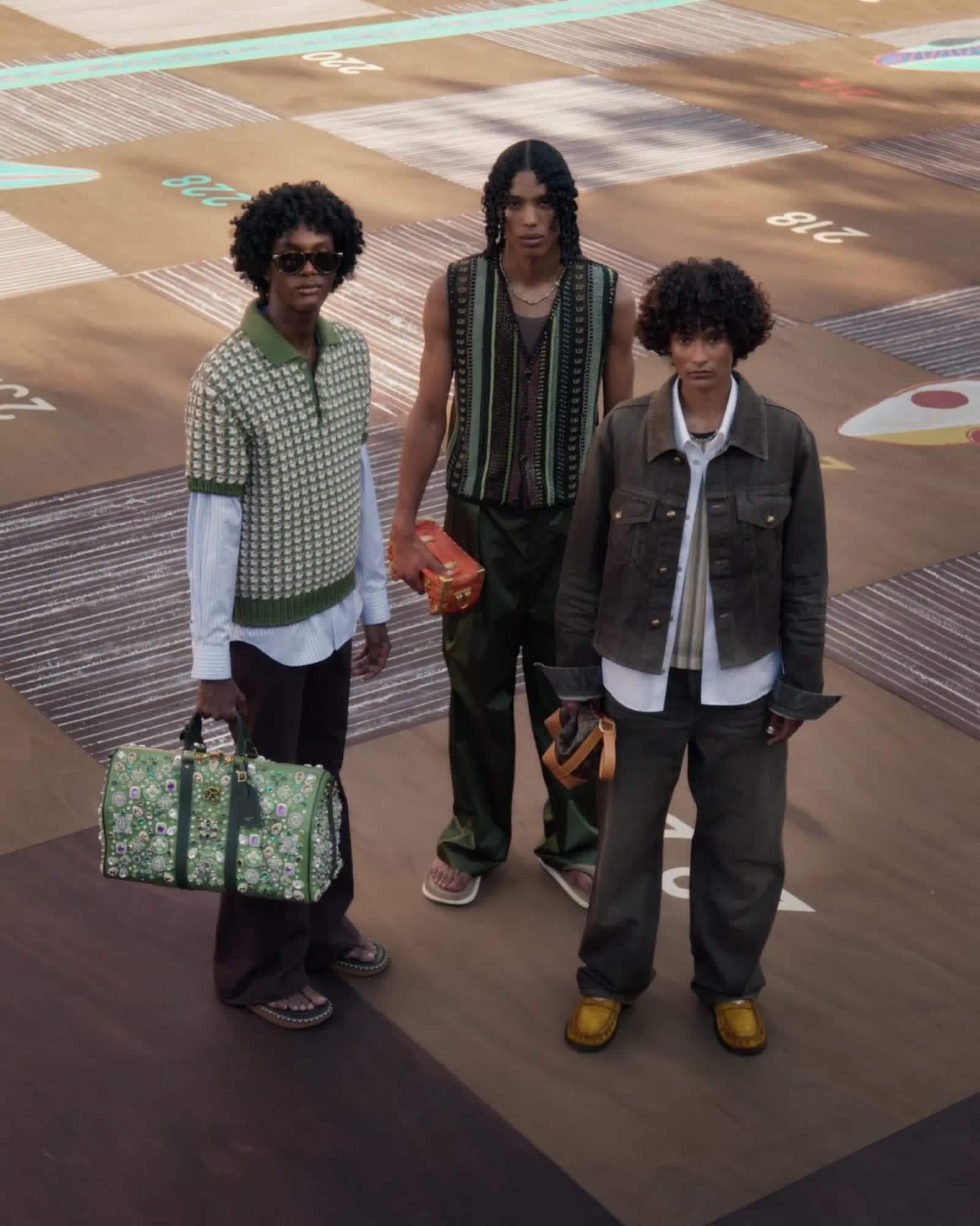 與 Studio Mumbai 合作打造的場景,將傳統的蛇梯棋放大為真人大小的建築,透過文化融合重新建構標誌性的 Damier 圖案——將觀眾和模特兒轉變為一個充滿可能性的隱喻舞台上的玩家。