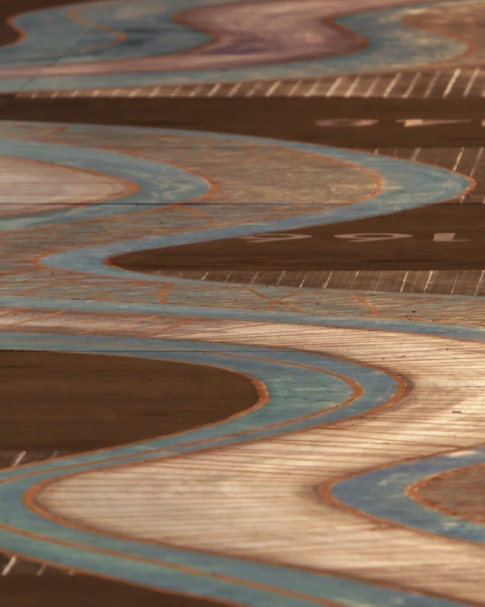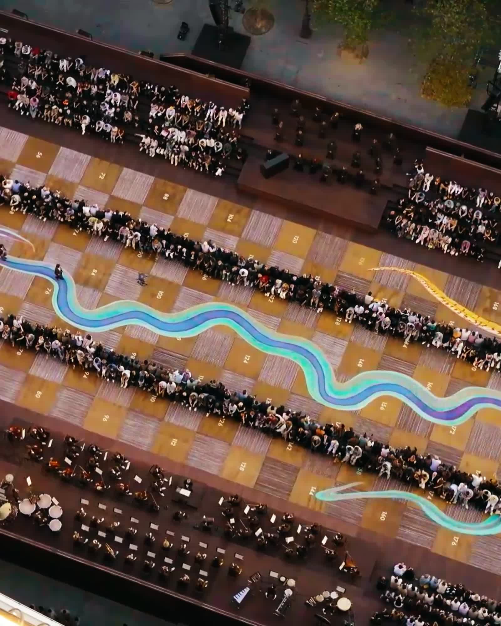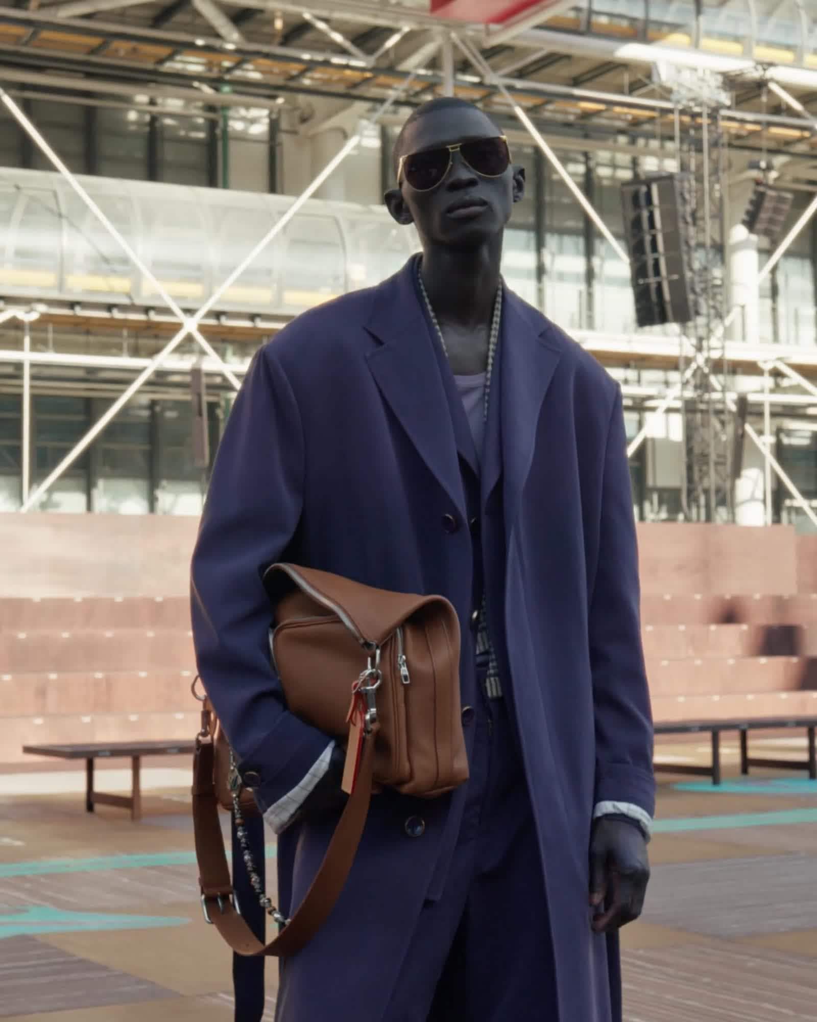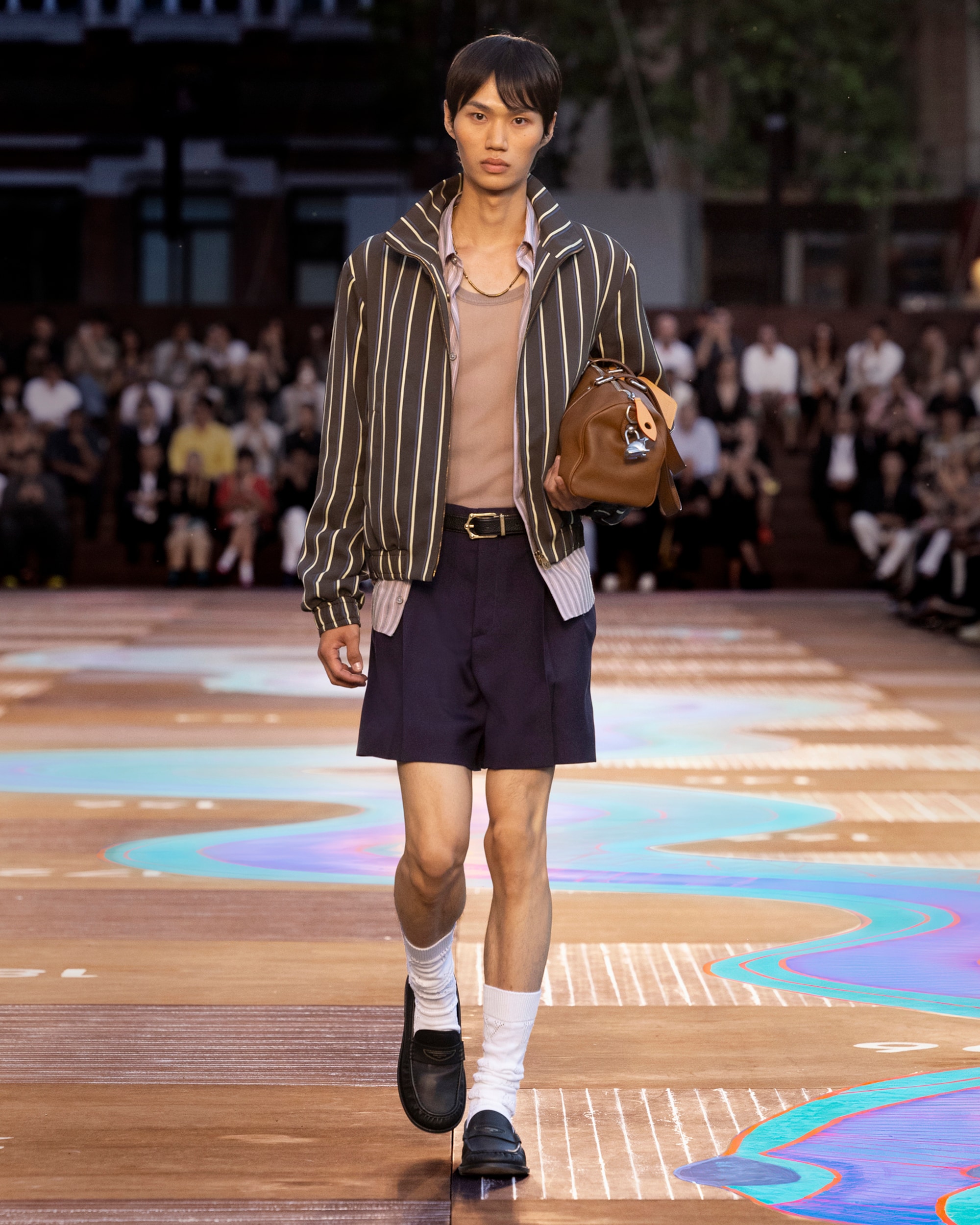 與 Studio Mumbai 合作打造的場景,將傳統的蛇梯棋放大為真人大小的建築,透過文化融合重新建構標誌性的 Damier 圖案——將觀眾和模特兒轉變為一個充滿可能性的隱喻舞台上的玩家。