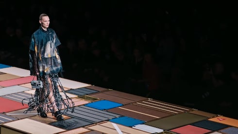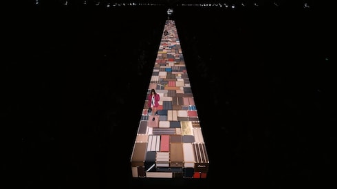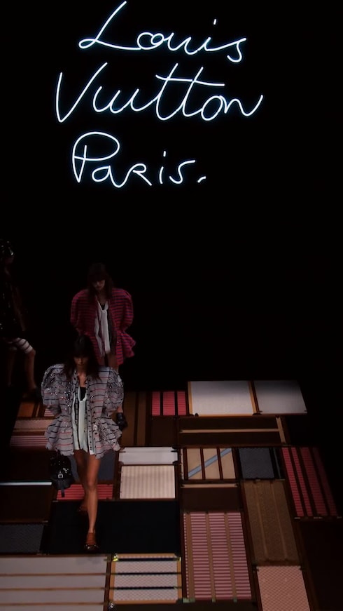 Nicolas Ghesquière 的時裝展中央舞台由逾千個行李箱組成,稜角分明,向路易威登的傳奇歷史致敬,而背後則是懾人的鏡面結構,倒映出巴黎羅浮宮卡利庭院的宏偉建築。