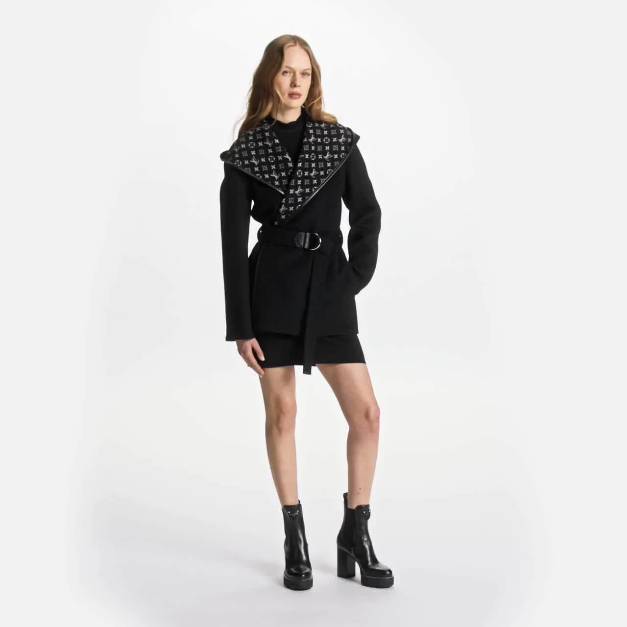 這款時尚的裹式短大衣以亮麗色彩打造全新造型,飾以系列的Louis Vuitton Paris腰帶,展現現代氣息。雙面羊毛混紡面料既柔軟輕盈且十分保暖,配襯寬闊的連帽加強從容感覺,內層則綴有經典的Monogram圖案提花織物。