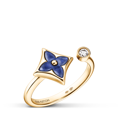 這款Color Blossom系列珠寶向品牌創辦人之子Georges-Louis Vuitton於1896年創作的經典Monogram花卉圖案致敬。珍貴的戒指以18K(750/1000)黃金鑄造,鑲有蘇打石精雕細琢而成的星形主飾,並經手工拋光出亮麗光澤。精緻的寶石需經過數月打造,方能完美呈現細緻的弧線及閃爍光芒。此精緻的戒指適合與同系列其他款式疊戴或混搭佩戴。