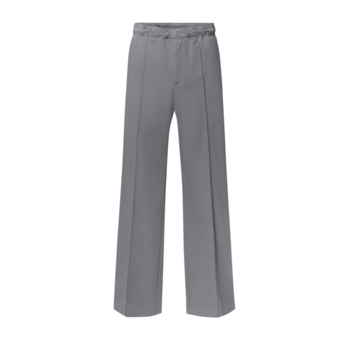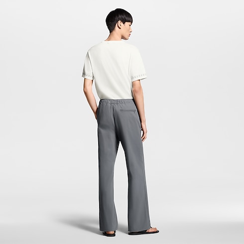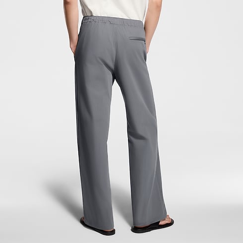 這款淡灰色抽繩長褲以輕盈棉質混紡緞布縐綢裁製,完美糅合正裝與休閒風格,塑造隨性優雅的造型。垂墜流暢的廓形配有舒適的彈性褲腰及正面壓褶,左邊褲管飾以運動風矽膠印花Louis Vuitton標誌,增添現代時尚細節。長褲能完美襯托本系列的花卉圖案,非常適合於春日穿著,盡顯高雅品味。