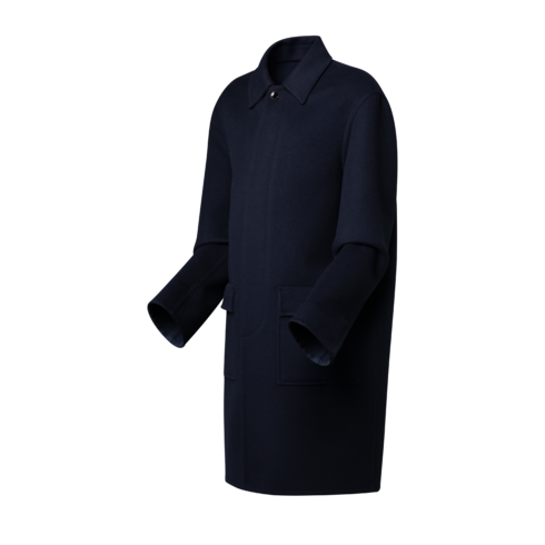 這款Navy藍色駕車大衣精緻優雅,百搭易襯,完美搭配多種不同造型。大衣選用奢華柔滑的羊毛及絲質混紡雙面布料裁製,配上綴滿LV Blason提花圖案的內層襯裡,背部還飾有Marque L.Vuitton Déposée皮革貼章。襯衫式衣領及寬大的翻蓋口袋流露從容高雅的氣息。