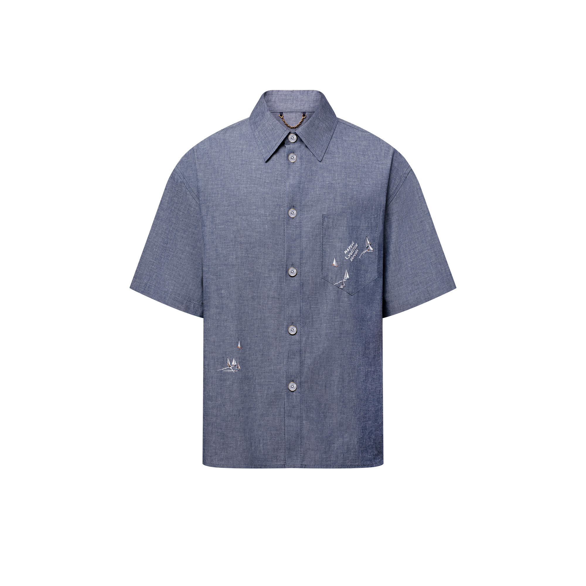 這款饒富夏日風情的Chambray短褲飾以LV Regatta圖案,靈感源自此系列郵輪之旅的繁忙港口。精緻帆船刺繡圖案於左褲腿下方呈現,並於背面右側口袋上組成LV標誌。票據口袋飾有Marque L.Vuitton Déposée刺繡標誌,背面更以Damier磨砂皮革標籤注入品牌格調。款式可配襯同系列襯衫,締造迷人套裝造型。