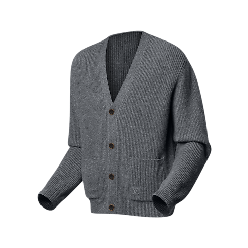 這款優雅灰色山羊絨開襟外套選用柔軟羅紋針織面料裁製,締造奢華雋永造型。左邊口袋以同色調LV刺繡標誌低調點綴,黑色珍珠母貝效果鈕扣鑲嵌於金色金屬底座,更添精緻格調。休閒廓形百搭易襯,於不同季節穿著都可增添暖意。