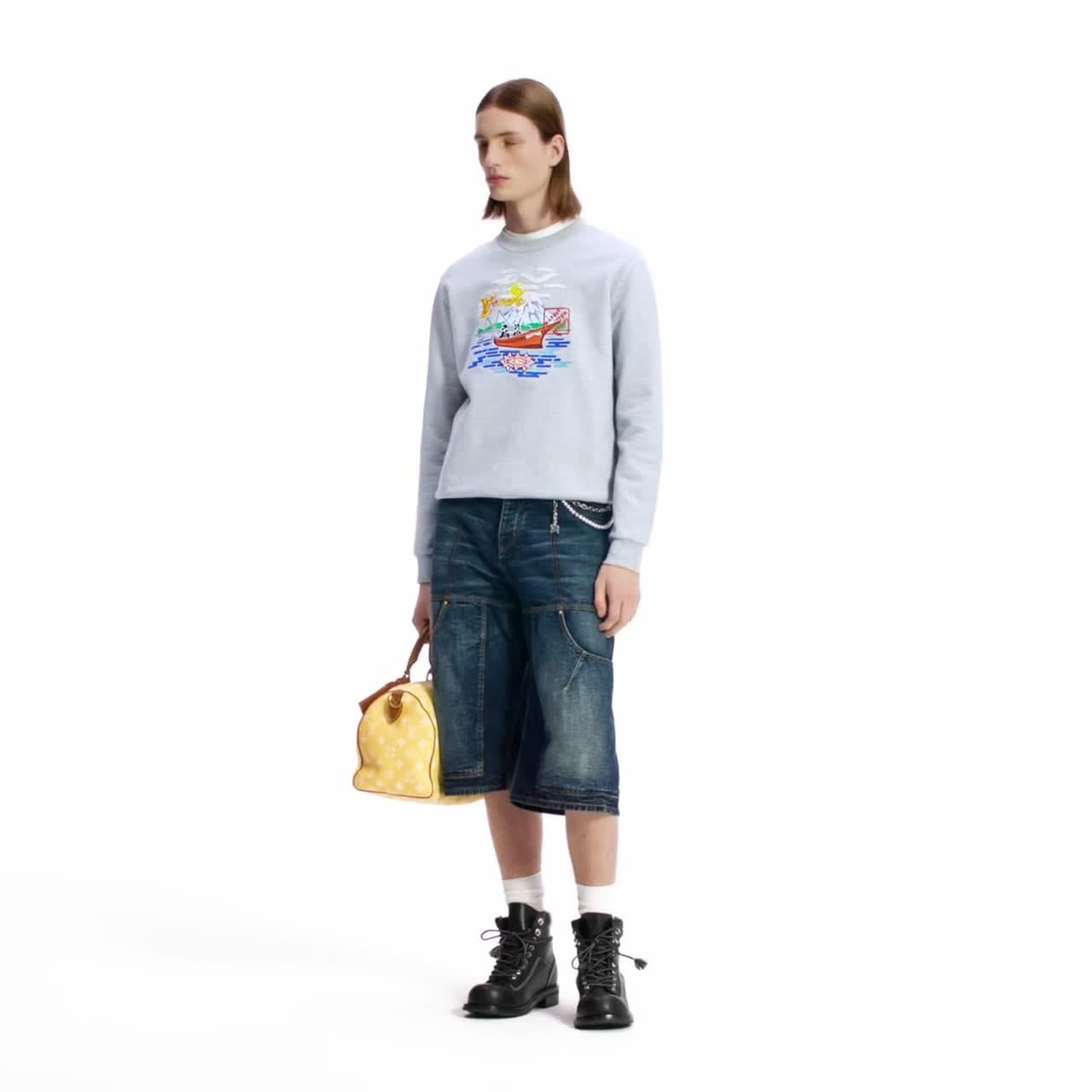 這款柔軟的棉質衛衣採用百搭的淺灰色調,綴以2025秋冬時裝展的鮮明刺繡。標誌性的圖案向系列背後Pharrell與Nigo合作的深厚友誼致敬,充滿詩意的景色描繪了漁船和兩位藝術家。背面綴有皮革Marque L.Vuitton Déposée標籤,令這個休閒款式更臻完美。
