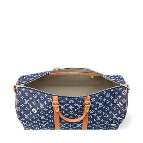 Keepall Bandoulière 50展現品牌全新演繹的牛仔布設計,將Monogram圖案直接編織於布料之屸。牛仔布經過特別處理以增強耐用性,並經水洗工藝呈現最終質感,隨後更以細緻的白色花卉刺繡點綴。全新的金屬澆水壺吊飾為作品增添時尚且奪目的細節。