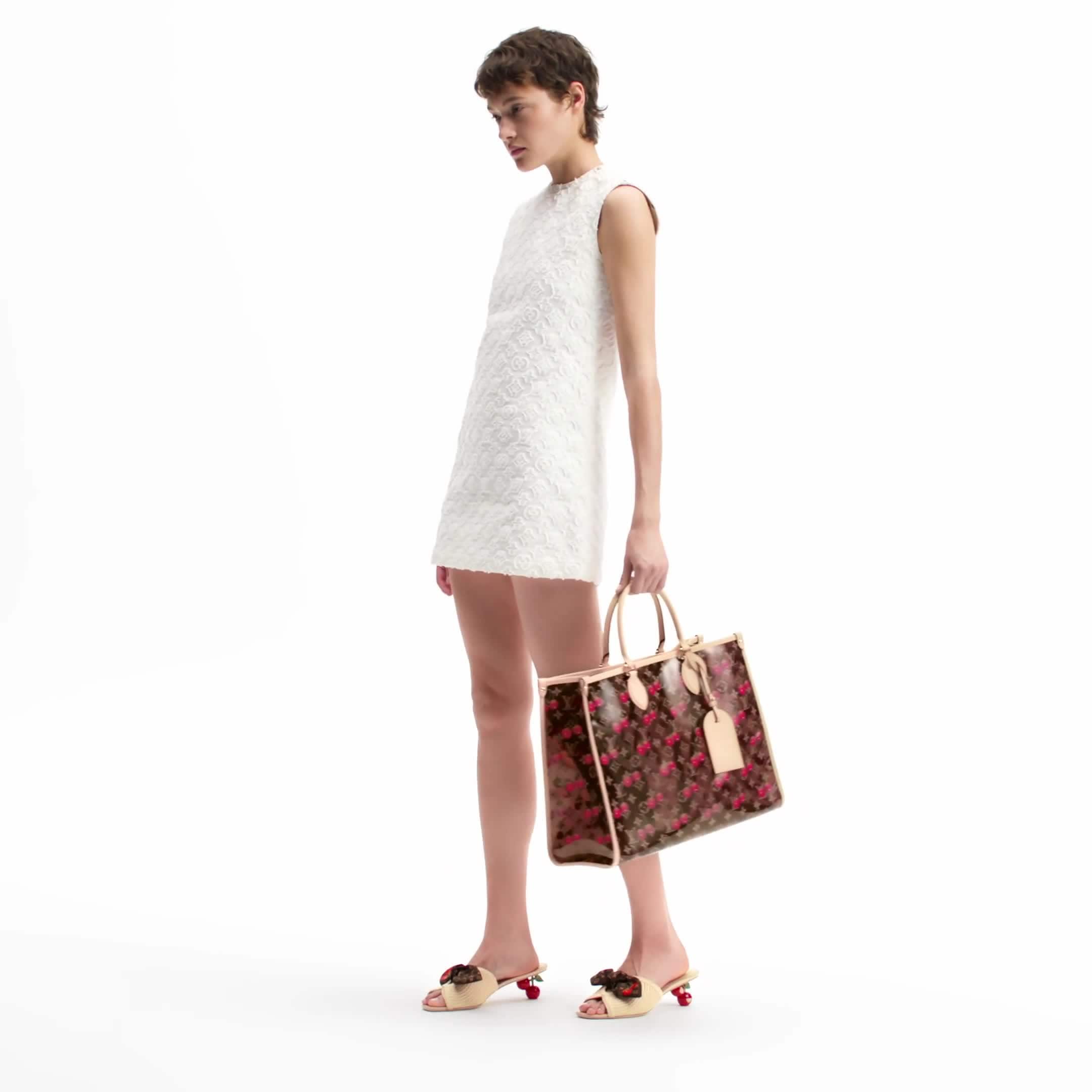 這款來自備受愛戴的復刻版Louis Vuitton x Takashi Murakami系列的Cherie涼鞋造型鮮明輕便,採用充滿活力的個性設計。鞋面選用編織拉菲草製作,浪漫風格綁結花卉裝飾以經典Monogram圖案點綴,並糅合鮮豔的櫻桃圖案,增添熱情洋溢的格調,完美呼應展現日本藝術家村上隆民俗玩味風格的雕塑效果鞋跟。