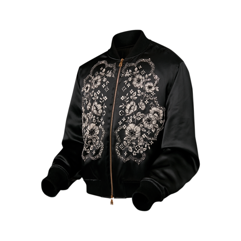 這款定製的黑色圖案外套展現2024秋冬時裝展時尚考究的西部美學。外套採用亮澤的純絲混紡面料製作,正面印有銀灰色的花卉圖案及Monogram花卉圖案,並精心地以人手繡上亮片、水晶及珠飾。這款休閒而獨特的款式展現日夜皆宜的精緻感。