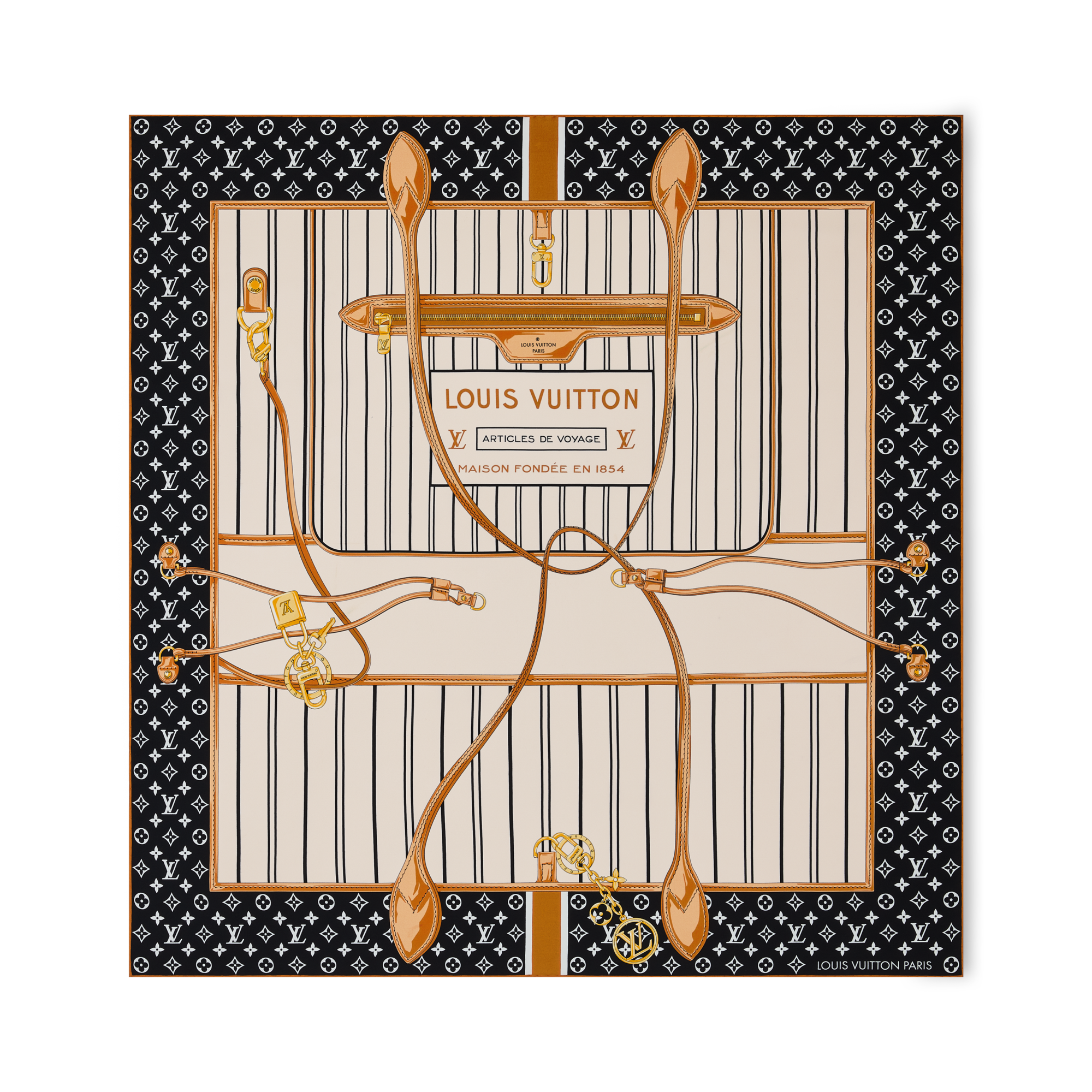 這款My Neverfull 90方巾以經典手袋為靈感,向品牌的行李箱製作歷史致敬。引人注目的方巾以純絲製作,印花圖案刻劃了Neverfull手袋的肩帶,並配搭LV Circle標誌及掛鎖等標誌性圖案,此外更飾以Louis Vuitton標誌貼章,呼應品牌歷史悠久的硬箱,更添優雅的傳統氣息。