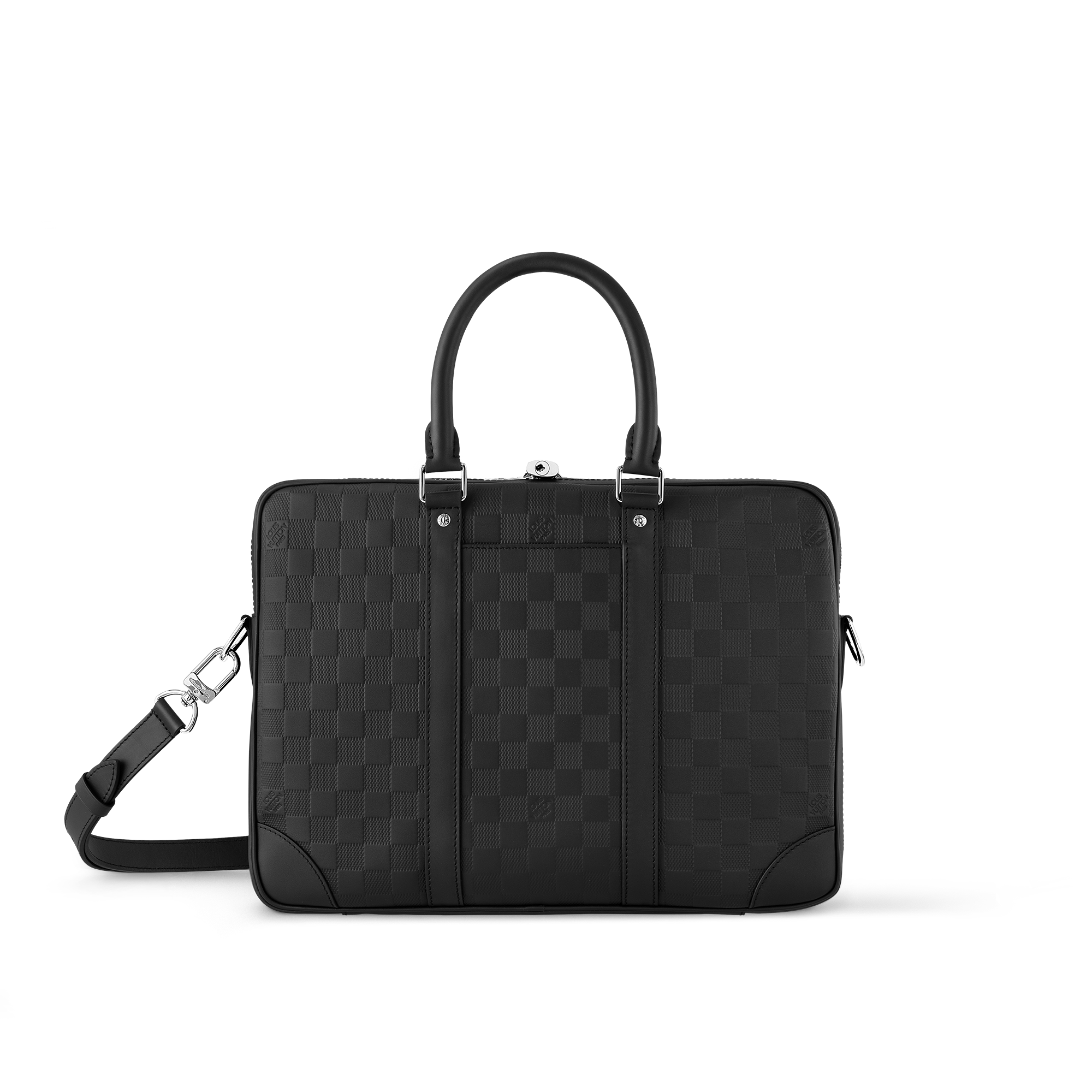 這款Porte-Documents Voyage PM公事包選用Damier Graphite塗層帆布製作,綴有黑色皮革側面飾帶、加固包角、頂端手柄和行李吊牌。袋款設有一個外袋,可收納智能手機,更配備襯墊內隔層,容量足以裝載一部13吋手提電腦,加上可拆式及可調節長度的肩帶,肩背攜帶輕鬆自在。