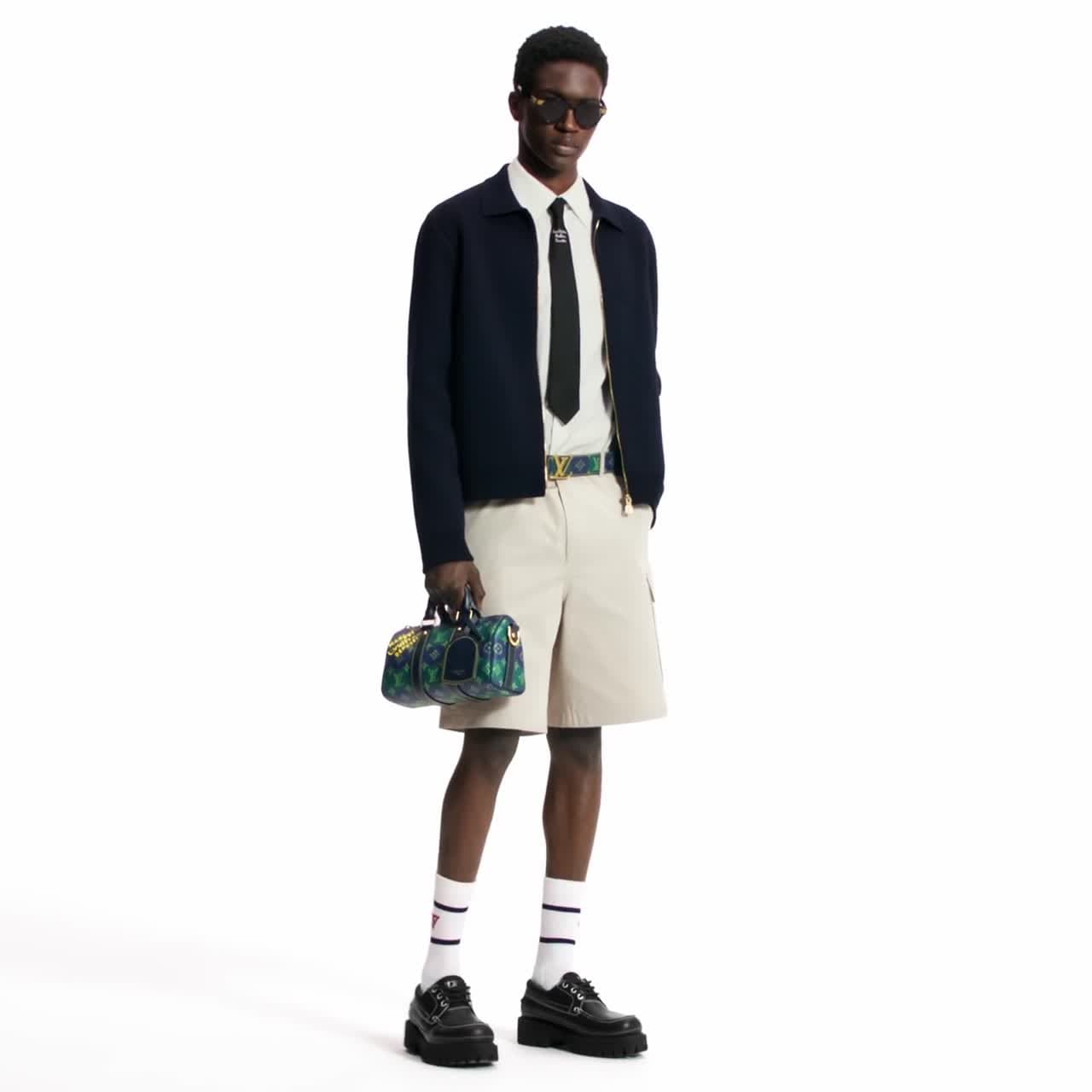 這款轉季款棉質工裝風短褲以優雅淺淡的Beige色調設計,每個工裝風口袋上均綴有同色調刺繡標誌,而右方後袋則綴有Louis Vuitton Malletier貼圖,設計奪目出眾。短褲配以珍珠鈕扣,為雋永設計增添精緻氣息,是衣櫥必備服飾。