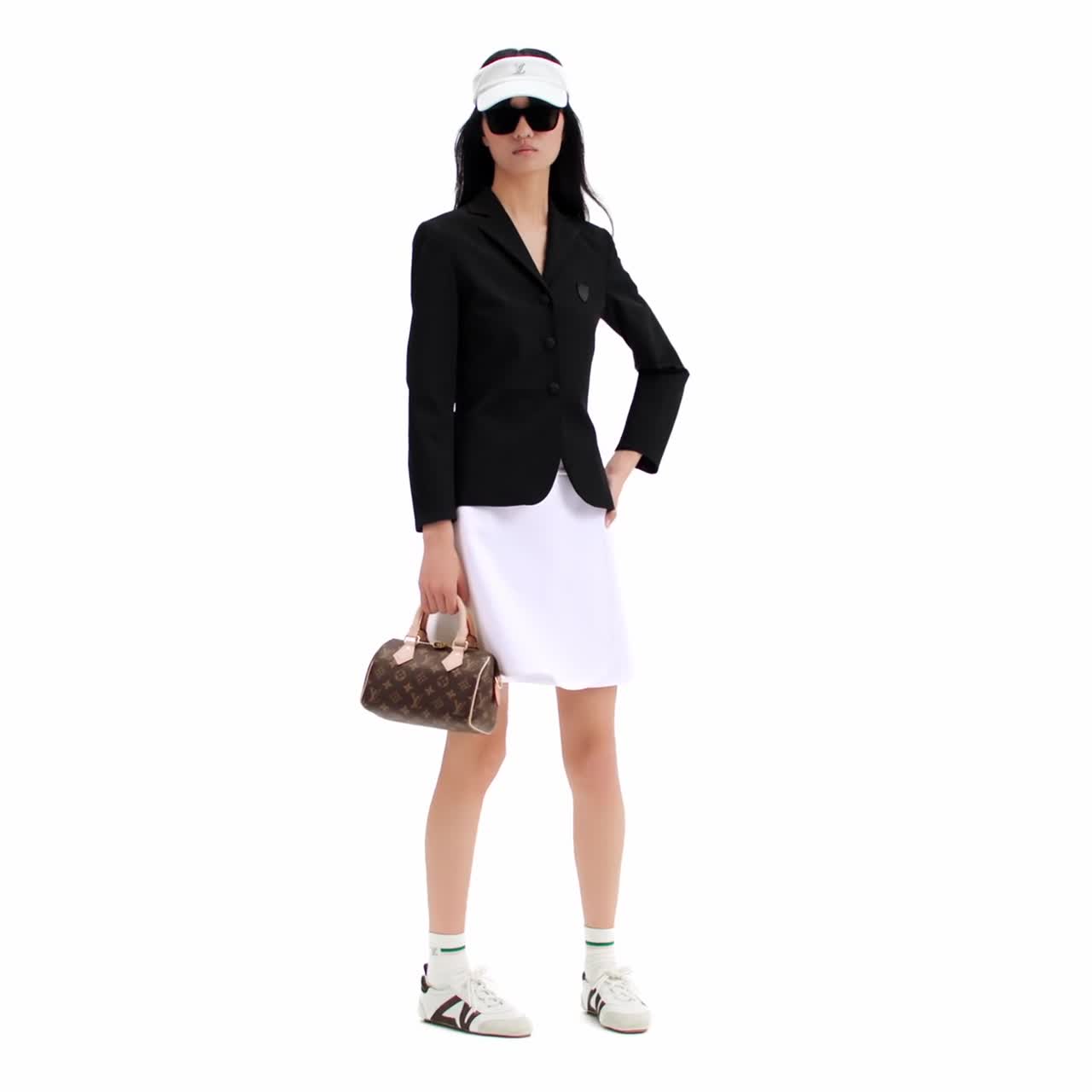 這款簡潔而富現代氣息的迷你半截裙以品牌標誌性的功能性針織布裁製,展現清新的運動風格。裙款採用俐落的A字版型,完美襯托正面裹式設計的弧形邊緣,而裙腰則以四顆金色按扣增添時尚的金屬裝飾。