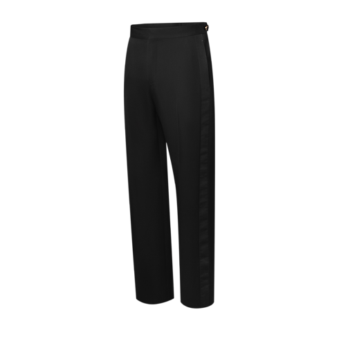 這款黑色禮服長褲是雋永的必備款式,適合於精緻的晚宴場合穿著。款式以亮澤的羊毛純絲混紡面料裁製,每邊褲管外側綴有嵌飾絲帶,可調節褲腰飾片則配有萊茵石Monogram花卉圖案和LV標誌鈕扣。長褲可搭配同系列的外套和西裝背心穿著,締造完整的西裝造型。