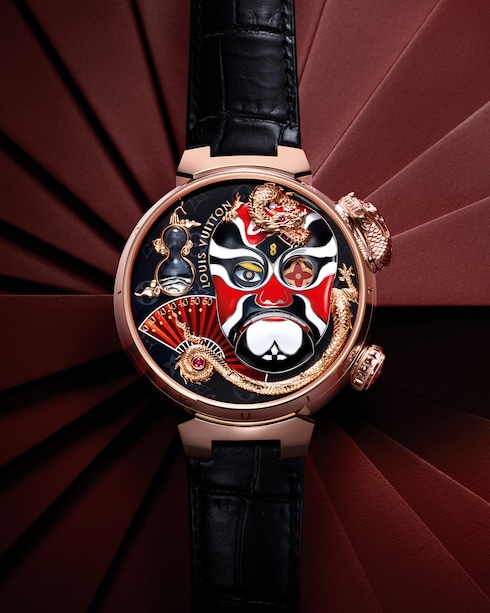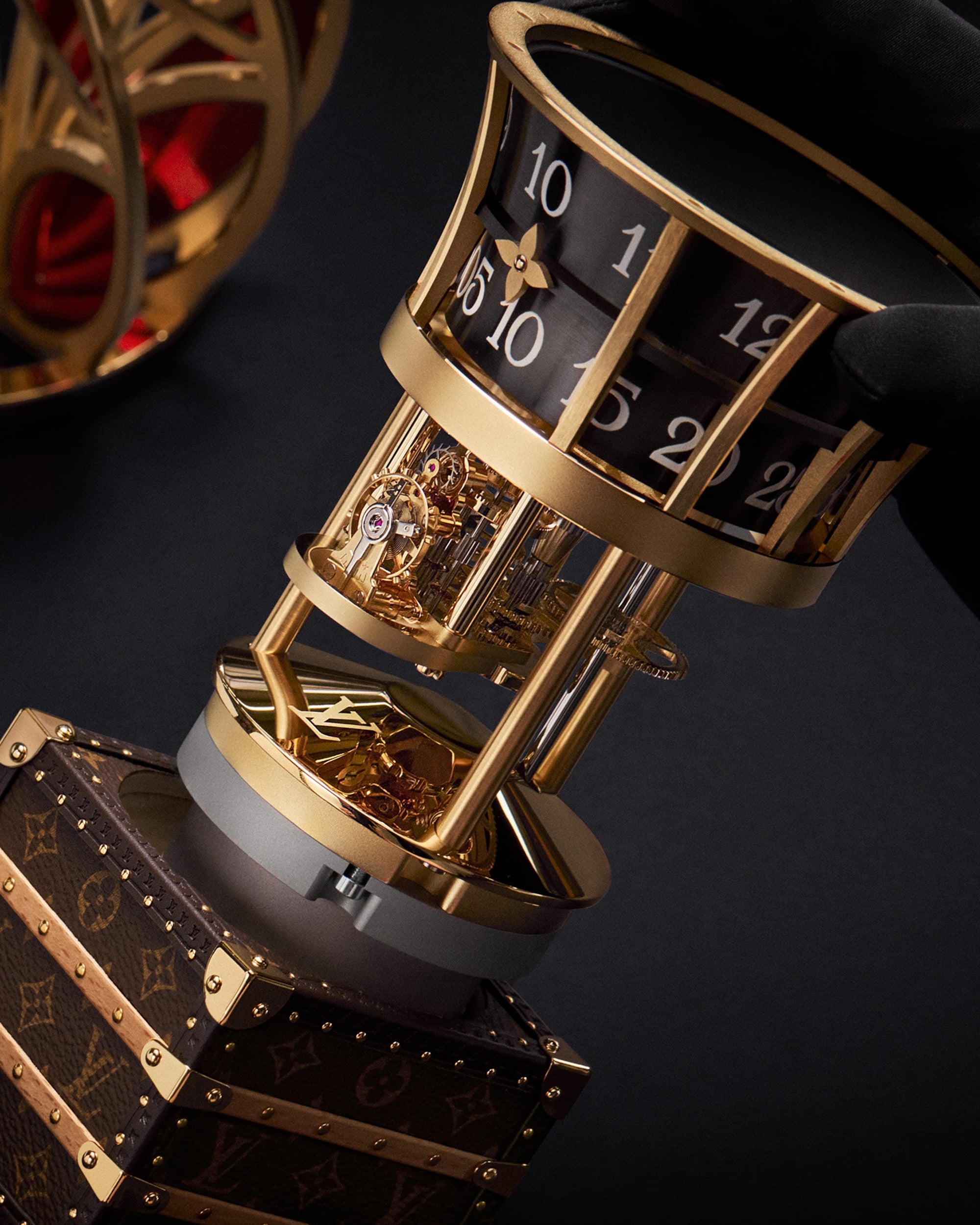 全球只有 8 個的限量版座鐘以奢華物料演繹 Montgolfière Aéro 座鐘,將高級製錶、高級珠寶和行李箱手製工藝共冶一爐。這款先進的時計精品以夢幻創新的手法重新演繹路易威登的經典傳統,並運用精湛的寶石鑲嵌技術添上各種珍稀寶石,配以精緻的微型行李箱。